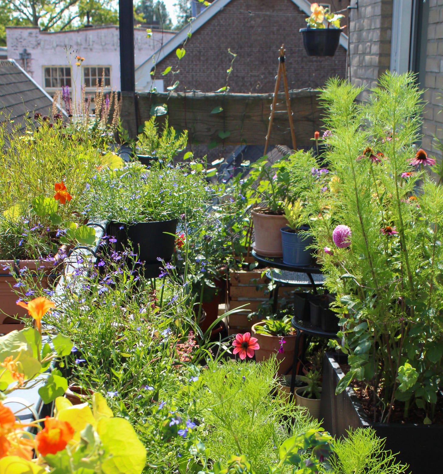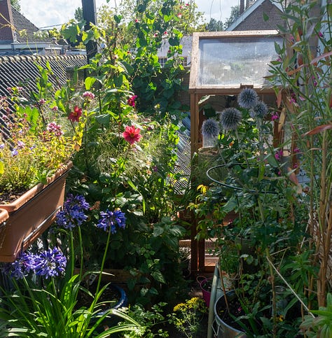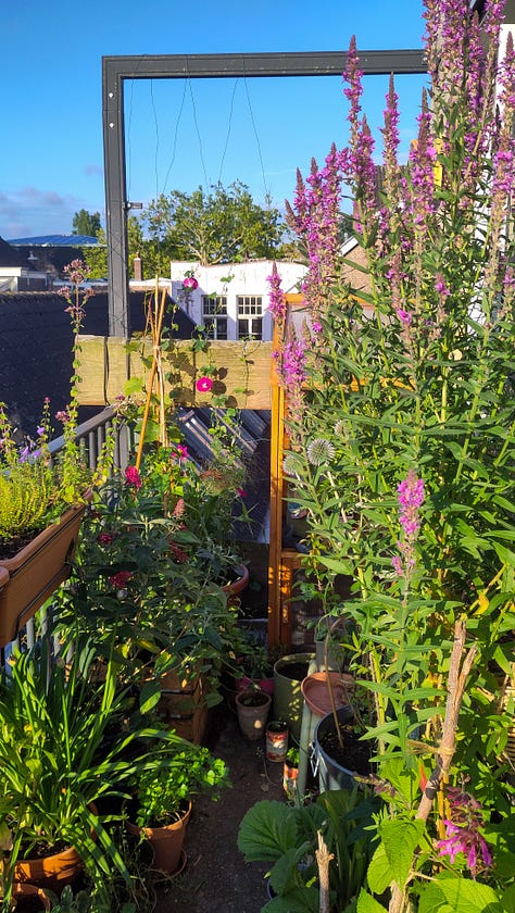 The elements of art can be found in the garden too: shape, form, texture, colour. It’s not just the colours of the flowers. It’s the shape and texture of leaves. The different shades of green; what’s lighting up in the shade. I’m noticing what else there is apart from the plants: the dark red beech in the background, the big balcony partition in light blue (which I’m trying to hide). The concrete floor, always covered in either algae or mud (which I’m also trying to hide). The sand-coloured brick wall, which I think will look spectacular covered in dark purple roses and wild honeysuckle (I recently added a big invisible trellis to achieve this). All of it influences one another.