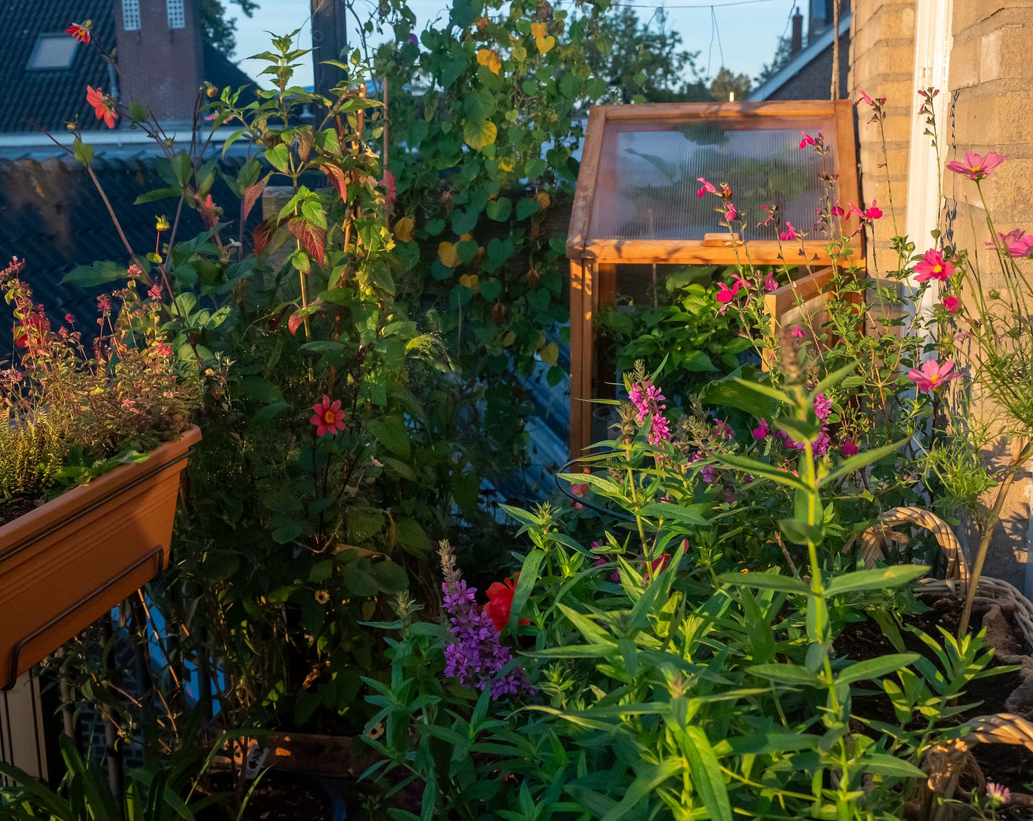 I loved the balcony’s left side this year, with the candy-pink rose, orange dahlias, betony and the velvety salvia ‘Nachtvlinder.’ But I reckon the right side’s summer display needs some editing. There are several different greens, there’s dark foliage and flowers in red, purple, coral, blue, cool magenta, yellow and orange.