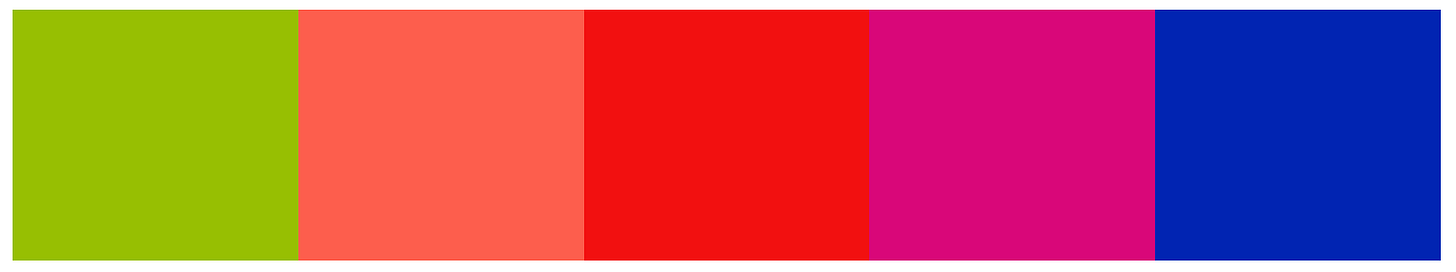 The colour white, for example, can feel very unnatural to me and isn’t pleasing in a bold mixed colour scheme. Red can be very dominant, as can yellow. However, both red and yellow can work with pink and orange, but in that case I don’t want to add prominent blues or purples which lessen the impact of that combination and make it feel unfocused. And the other way around (pink and orange work well with blue and purple, but then I’d leave red and yellow out). Of course the different possible shades of all these colours can influence this balance.